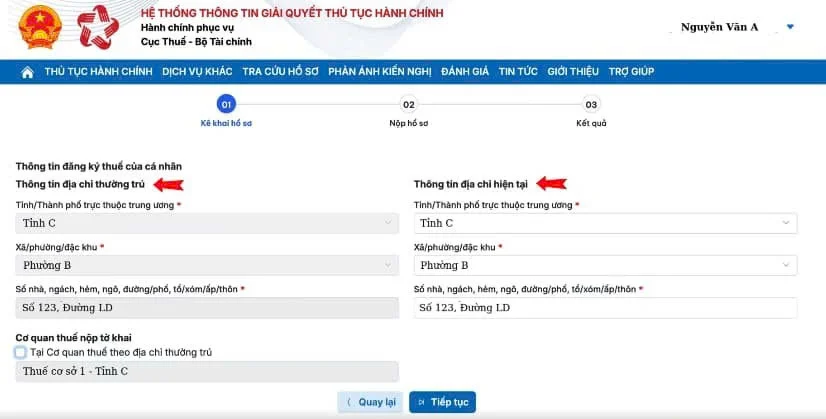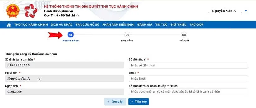 Người dùng điền đầy đủ các thông tin cơ bản theo yêu cầu của hệ thống và chọn Tiếp tục để sang bước kê khai chi tiết.