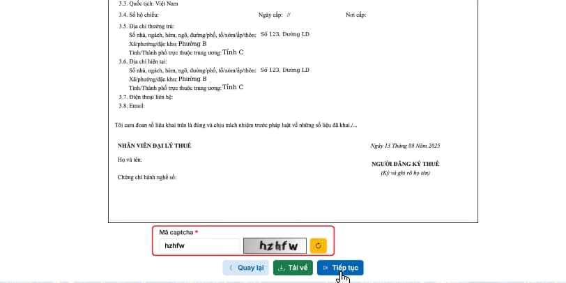- Sau khi rà soát thông tin, nếu thông tin đúng >> Nhập mã Captcha >> chọn Tiếp tục