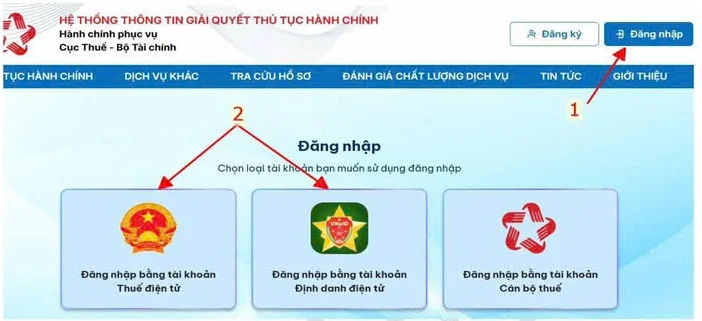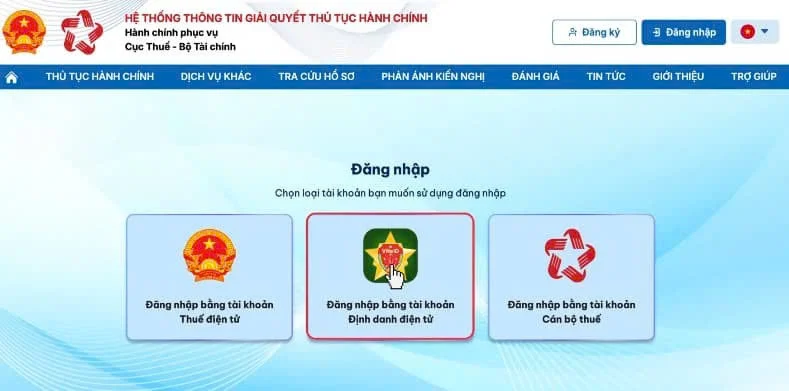 - Đăng nhập vào trang https://dichvucong.gdt.gov.vn/ => Đăng nhập => chọn đăng nhập bằng tài khoản thuế điện tử hoặc bằng tài khoản định danh điện tử đều được => chọn Doanh nghiệp