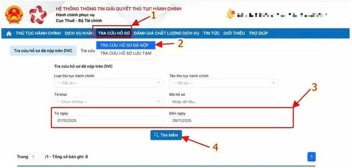 - Chọn Tra cứu hồ sơ đã nộp => Chọn thời gian => Chọn tìm kiếm để xem kết quả.