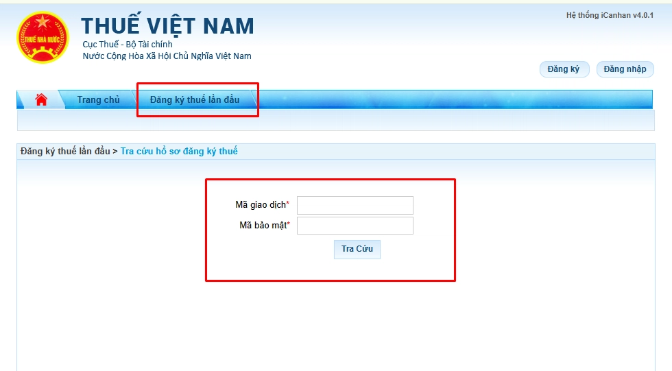 - Đăng nhập vào trang https://canhan.gdt.gov.vn/ => Chọn mục Tra cứu hồ sơ tại phần Đăng ký thuế lần đầu => Nhập mã giao dịch và mã bảo mật => Nhấn Tra cứu để xem kết quả.
