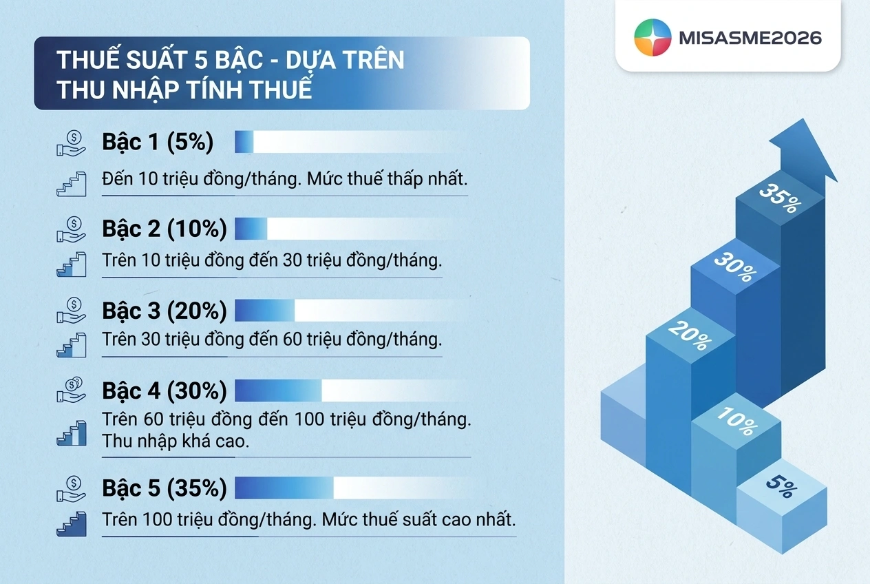 - Bậc 5 (35%) áp dụng cho phần thu nhập tính thuế trên 100 triệu đồng/tháng, là mức thuế suất cao nhất trong biểu thuế hiện hành.