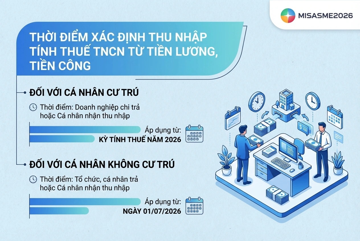 - Đối với cá nhân cư trú: thời điểm doanh nghiệp chi trả thu nhập hoặc thời điểm cá nhân nhận được thu nhập; áp dụng từ kỳ tính thuế năm 2026.