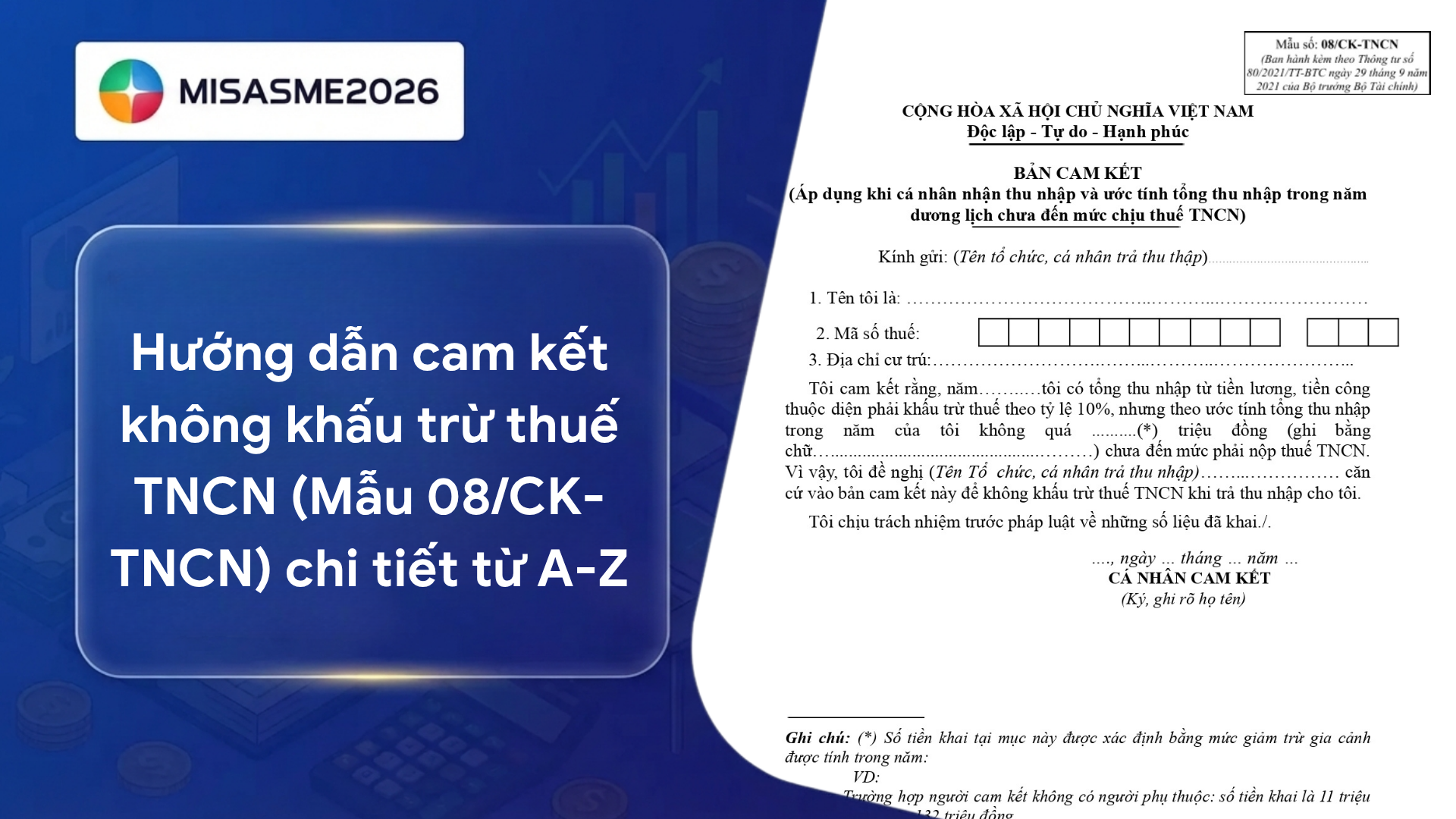 Bạn đang băn khoăn khi nào được làm cam kết không khấu trừ thuế TNCN và cách thực hiện đúng theo quy định mới nhất? Đừng bỏ qua bài viết này! Nội dung dưới đây của phần mềm quản lý kế toán MISA SME sẽ giúp bạn hiểu rõ điều kiện, cách tính thu nhập và hướng dẫn chi tiết để áp dụng cam kết đúng chuẩn, tránh bị khấu trừ 10% không cần thiết.