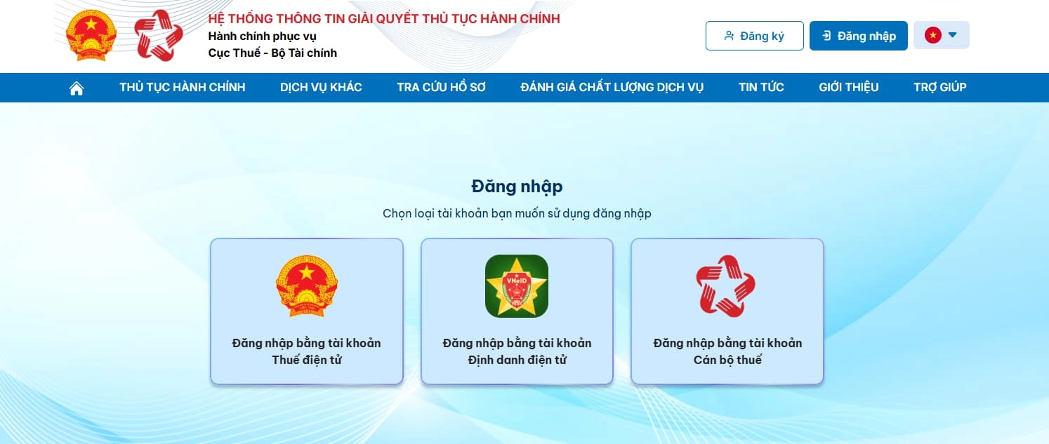 Sử dụng tài khoản định danh điện tử hoặc tài khoản đã đăng ký với cơ quan thuế để đăng nhập hệ thống.