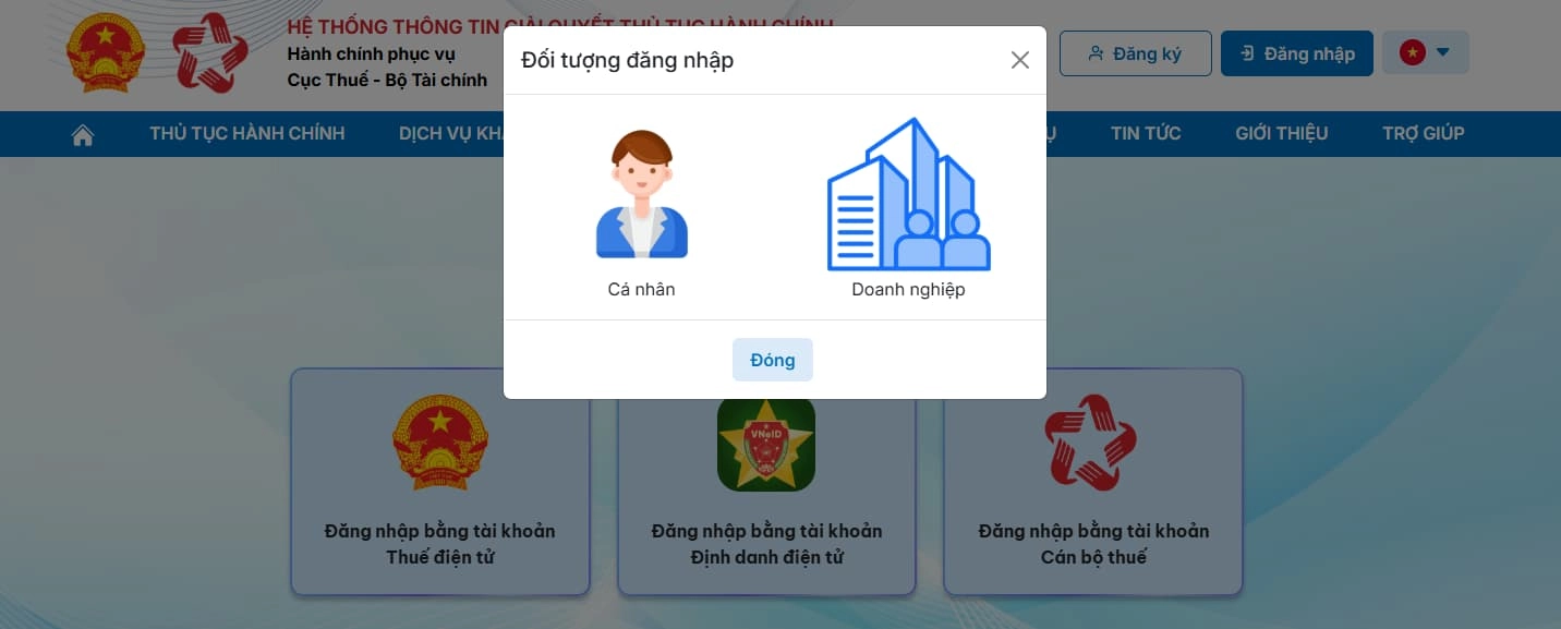 Sau khi đăng nhập thành công, chọn đối tượng Doanh nghiệp.