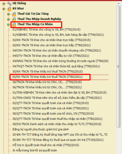 Tại giao diện chính, thực hiện theo đường dẫn: Thuế Thu nhập cá nhân → Chọn mẫu tờ khai: 05/KK-TNCN – Tờ khai khấu trừ thuế TNCN (TT80/2021)
