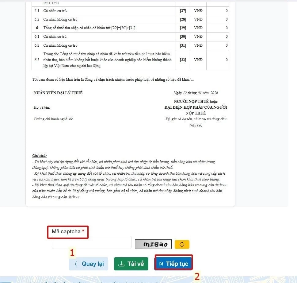 Sau khi chọn xong kỳ kê khai, hệ thống sẽ hiển thị tờ khai để nhập số liệu.