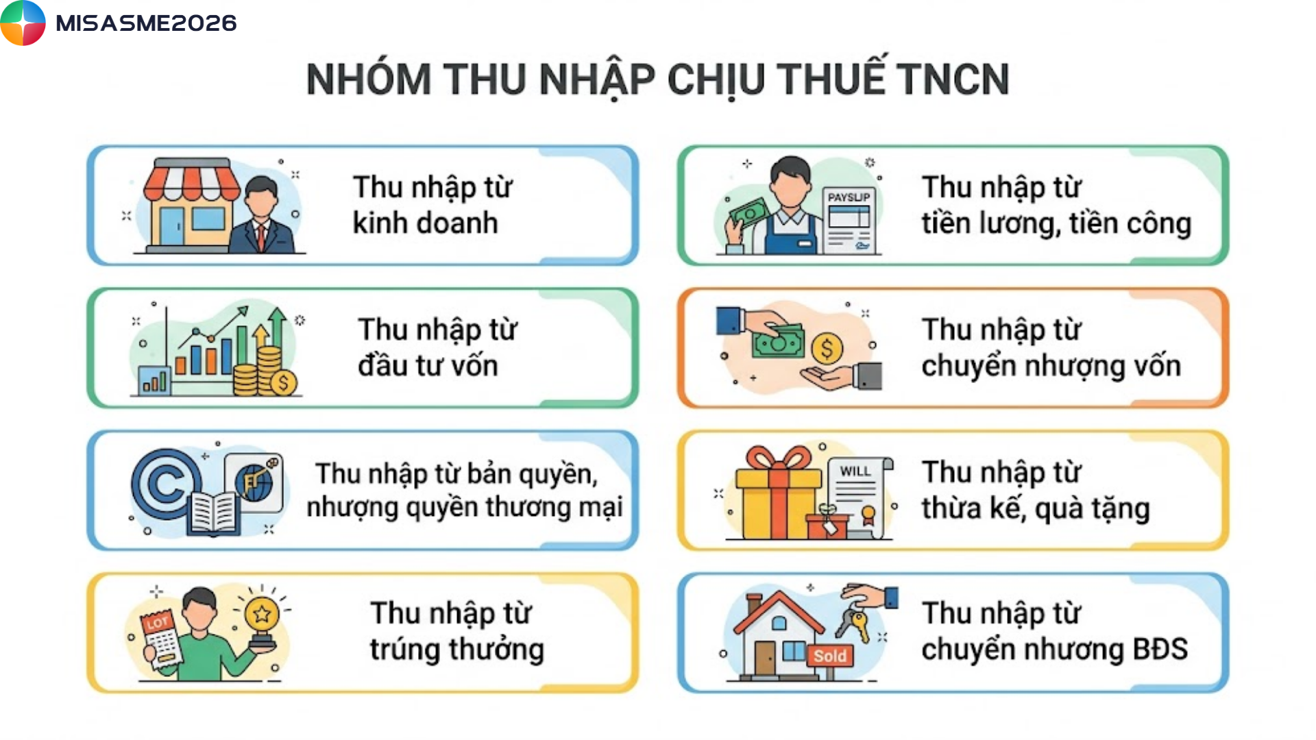 | 8 | Thu nhập từ thừa kế, quà tặng | Bao gồm bất động sản, chứng khoán, phần vốn góp và tài sản phải đăng ký quyền sở hữu |