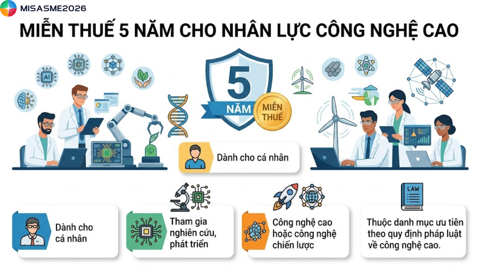 - Miễn thuế 5 năm cho nhân lực công nghệ cao: Dành cho cá nhân tham gia nghiên cứu, phát triển công nghệ cao hoặc công nghệ chiến lược thuộc danh mục ưu tiên theo quy định pháp luật về công nghệ cao.