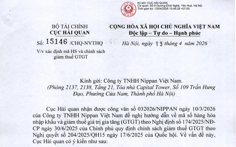 Ngày 13/4/2026, Cục Hải quan – Bộ Tài chính đã ban hành Công văn số 15146/CHQ-NVTHQ trả lời Công ty TNHH Nippan Việt Nam về việc xác định mã HS và chính sách giảm thuế GTGT theo Nghị định 174/2025/NĐ-CP đối với mặt hàng tấm gá kim loại dùng cho cụm phát điện ô tô.