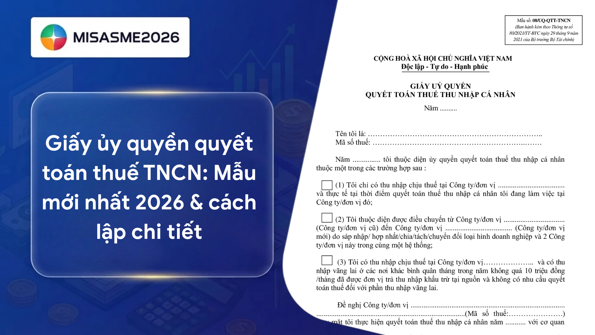 Giấy ủy quyền quyết toán TNCN là thủ tục quan trọng giúp người lao động ủy quyền cho doanh nghiệp thực hiện quyết toán thuế thay, từ đó tiết kiệm thời gian và hạn chế sai sót. Tuy nhiên, không phải ai cũng nắm rõ điều kiện áp dụng và mẫu biểu mới nhất. Nếu bạn đang cần tìm hiểu về giấy ủy quyền quyết toán TNCN, hãy theo dõi ngay nội dung dưới đây của phần mềm kế toán doanh nghiệp MISA SME để thực hiện đúng quy định.