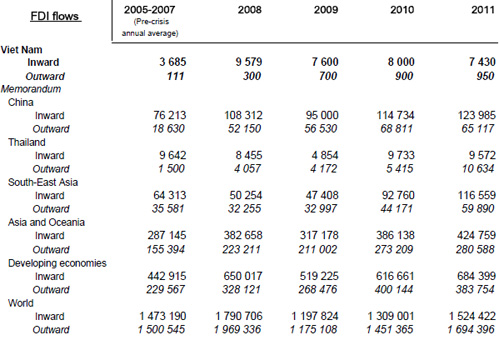 Tổng vốn đầu tư trực tiếp nước ngoài và Việt Nam trong năm 2011, theo Liên hợp quốc, chỉ đạt 7,43 tỷ USD, giảm mạnh so với mức 8 tỷ năm 2010. Tuy nhiên, DN Việt lại mạnh tay hơn khi đầu tư ra nước ngoài.
